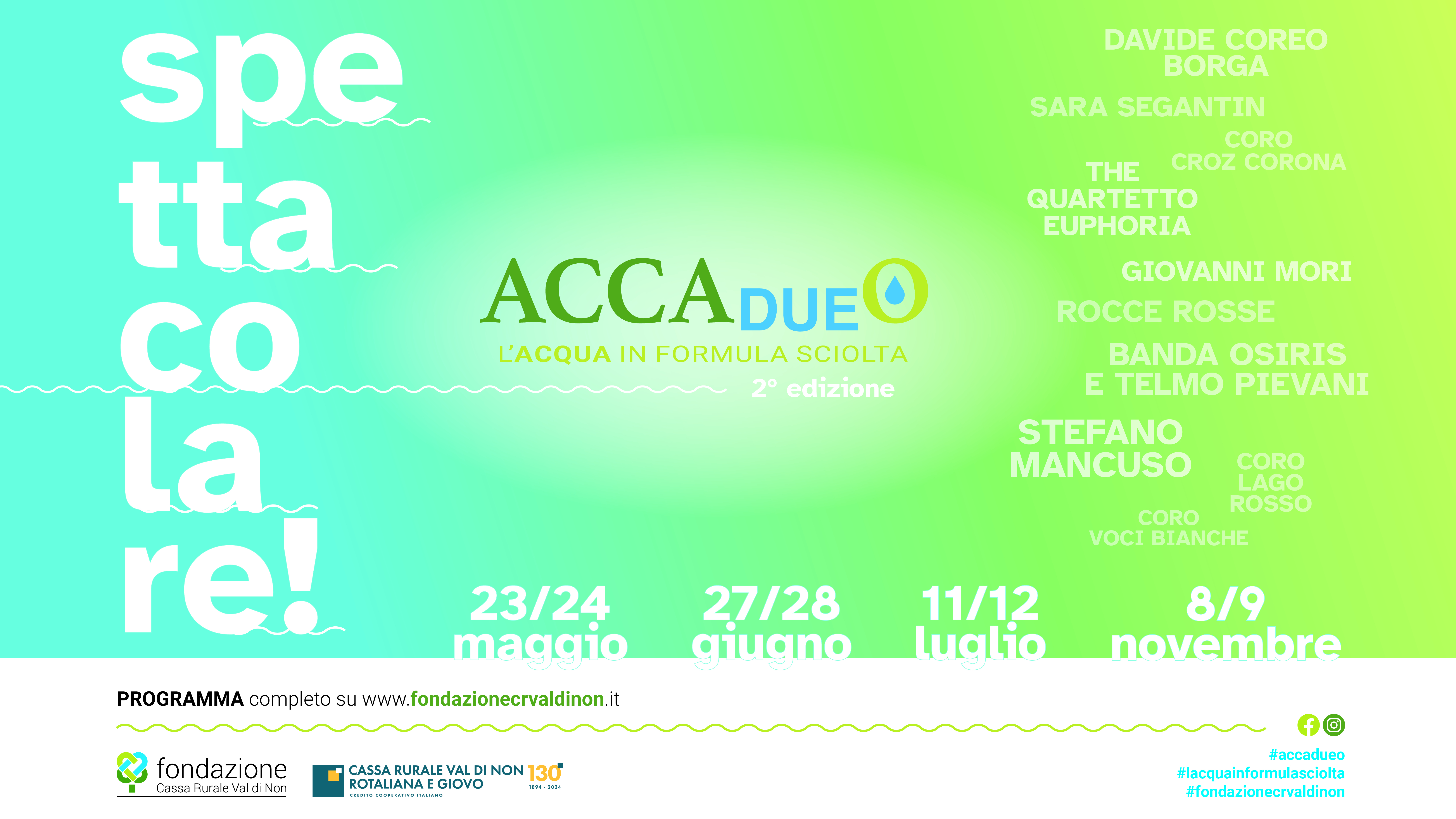 Lungo il biennio 2023/2024, la Fondazione Cassa Rurale Val di Non ha inteso affrontare il tema dell’acqua sotto svariati punti di vista, portando "letteralmente" a galla questioni legate all’espressione chimica H2O attraverso una formula divulgativa differente, concentrata, emozionale. L'intento è di lasciare ai partecipanti dei punti di domanda con nuovi spunti per una diversa sensibilizzazione. Natura, sostenibilità, divulgazione sono alcuni dei comparti entro i quali verrà trattato e analizzato il tema “acqua” attraverso quattro importanti appuntamenti: due in Val di Sole e due in Val di Non. Varie le location individuate per la loro forte connessione con l’elemento acqua di seguito elencate nell’ambito di un programma sovraccomunale di natura biennale (2023-2024).